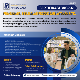 Pelatihan dan Sertifikasi BNSP untuk Pramuniaga untuk membantu mewujudkan Tenaga penjual yang terampil, serta memberikan pengakuan atas kompetensi tersebut.